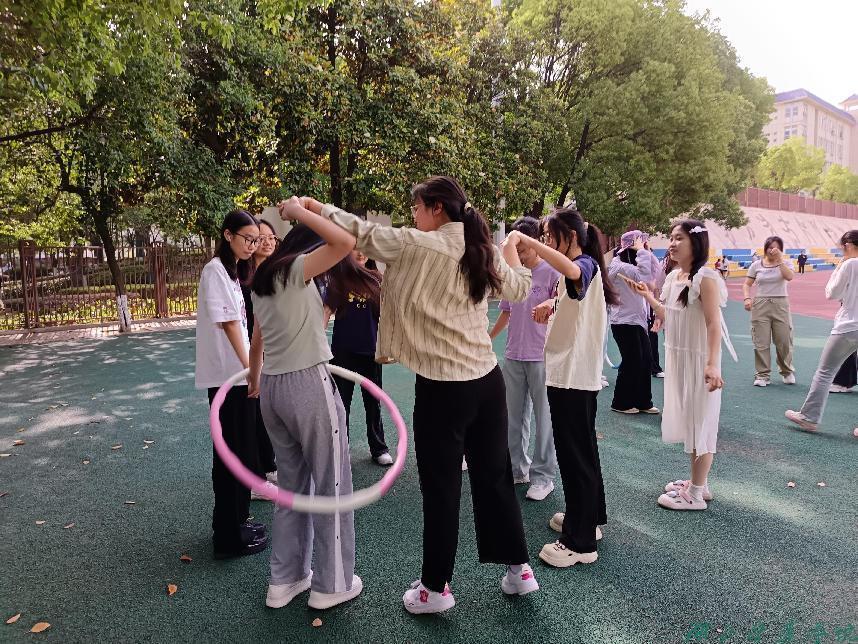 在“一圈到底”项目中,一个巨大的呼啦圈在8人团队中接力传递,同学们弓腰钻环、手脚并用,齐心协力传递呼啦圈,争分夺秒,欢笑连连。