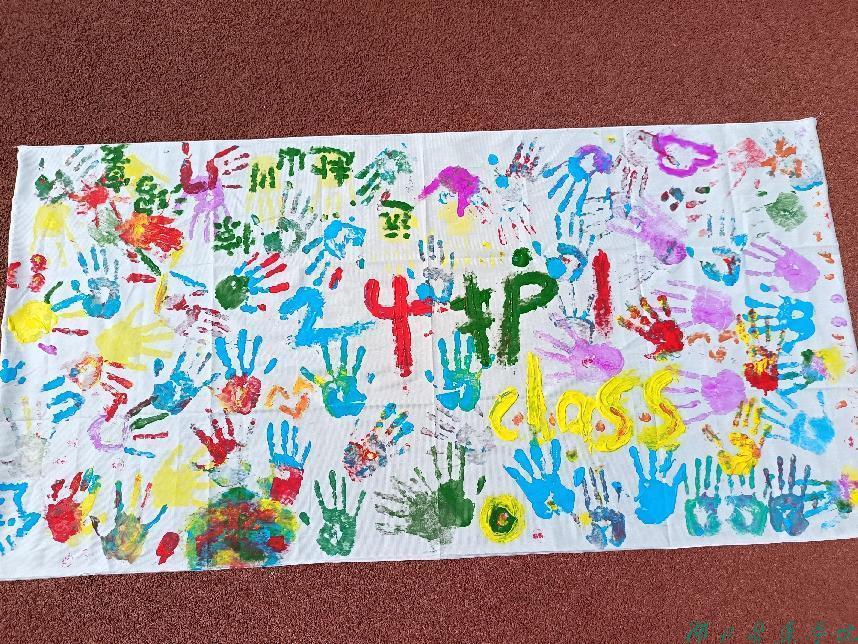 在“共绘班旗”环节中,同学们用手印与彩绘共同创作班级专属班旗,最终呈现的班旗融合了文艺元素与班级特色。