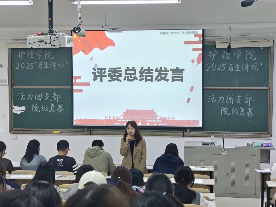 9支参赛队伍依次登场,通过多样化的形式展现了支部的活力与风采。药护23护理学1班以《青春聚力,护梦启航》为题,系统阐述了支部在思想引领和专业学习上取得的丰硕成果;23护本2班的《青春绽华彩,团旗舞新程》则通过丰富的活动案例,生动展示了其在组织建设和学风建设上的扎实成效;23涉外护理班的《行远自迩,笃行不怠》聚焦专业实践与国际视野的培养,彰显了涉外护理学子的开阔眼界与进取精神。各支部的汇报形式新颖,有的结合PPT进行生动讲解,有的则巧妙运用视频、情景短剧等创新载体,将“学思想、强党性、重实践、建新功”的总体要求融入青春叙事之中,引人入胜。最终经评委组依据评分标准认真评议,本次比赛结果最终揭晓:药护23护理学1班、23护理学3班、23涉外护理班将代表学院参加学校决赛。