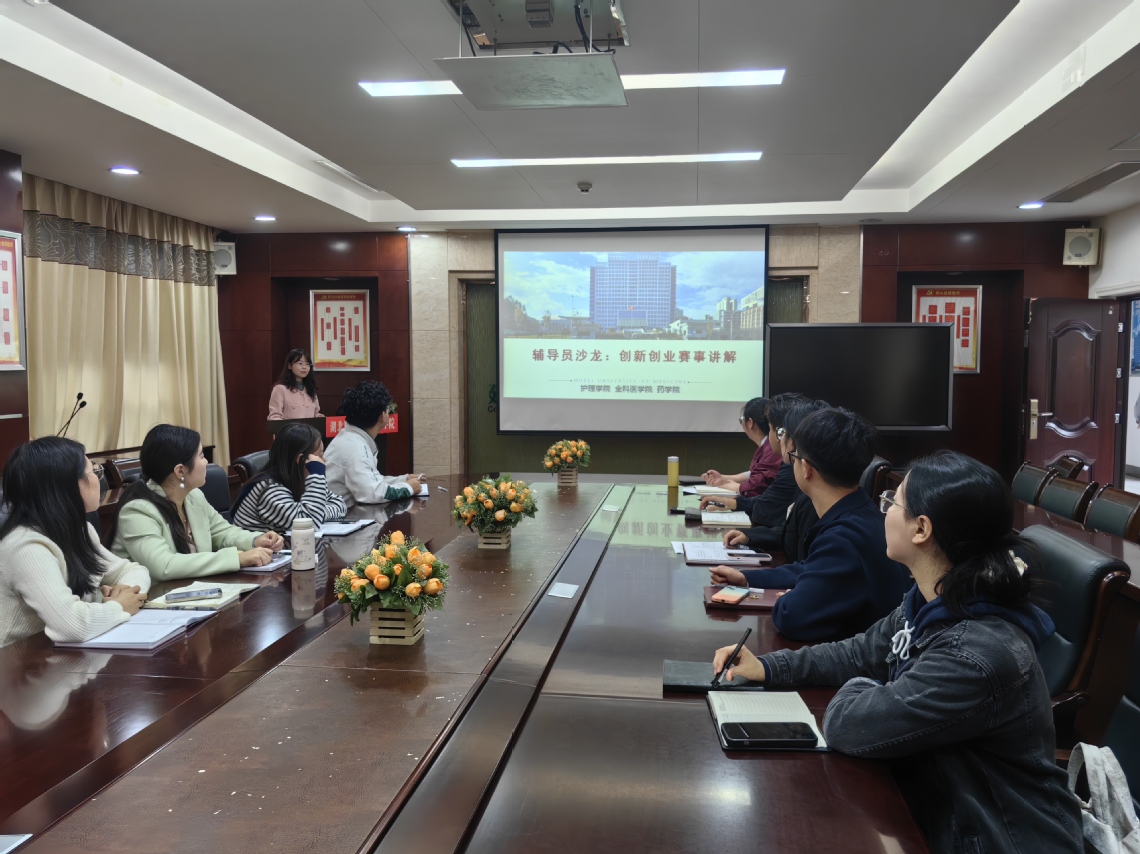 本网讯(通讯员 沈锐)为激发学生的创新创业热情,提升各学院在“挑战杯”、“中国国际大学生创新大赛”等高水平赛事中的项目质量和竞争力,10月16日,米乐mile官方网站联合全科医学院、药学院举办了辅导员沙龙之创新创业赛事专场培训在8号楼二楼会议室成功举办。米乐mile官方网站院领导、班主任、三个学院全体辅导员参与了本次活动。沙龙由米乐mile官方网站沈锐主讲。